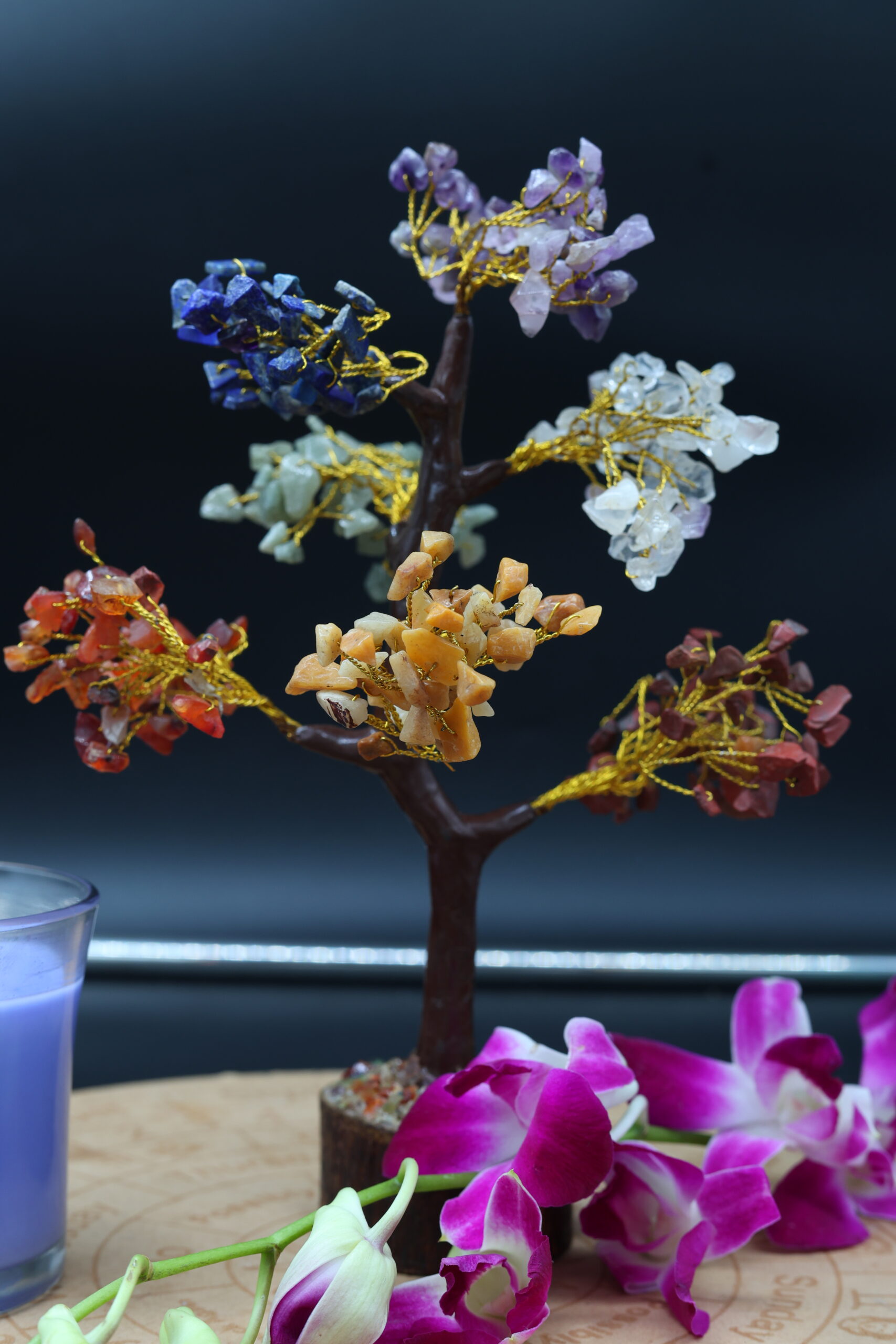 Each tree features natural healing crystals like Amethyst, Lapis Lazuli, Blue Aventurine, Green Aventurine, Yellow Jasper, Carnelian, and Red Jasper—each one corresponding to a specific chakra.